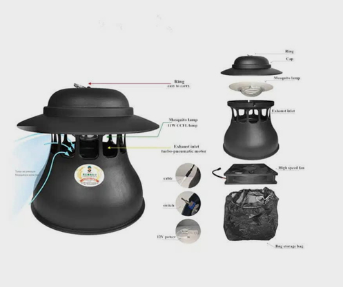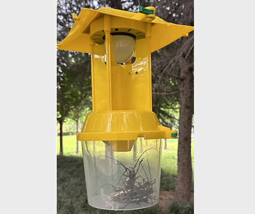 Solar-powered trap for forest, greenhouse, rice, cotton, fruit tree, storage, and underground pests. Covers up to 5 acres, charges during the day, lights up at night, and attracts pests using specific wavelength LEDs. Two-year warranty included. Photo suggestion: Solar lamp installed outdoors or in a greenhouse.